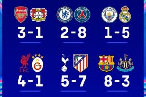 其余四支英超球队则纷纷止步本轮,且多数遭遇大比分惨败:曼城总比分1-5不敌皇马,切尔西2-8被巴黎横扫,纽卡3-8负于巴萨。热刺虽然在本轮对决中赢下比赛挽回些许颜面,但仍以总比分5-7不敌马竞,无奈告别欧冠赛场。