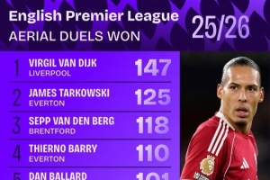 本赛季英超争顶成功榜:范戴克147次居首,塔科夫斯基次席