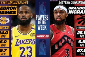 体育资讯4月14日讯 今日NBA官方宣布,湖人球星勒布朗·詹姆斯和猛龙球星布兰登·英格拉姆分别被评为本赛季第25周西部和东部周最佳球员。
