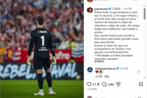 马竞门将穆索社媒写道:“我们拼尽全力,但这次还不足以夺冠。我们的信念依然坚定,头颅依旧高昂,因为唯一的失败就是停止尝试、放弃梦想。我毫不怀疑,我们将以更强大、更团结的姿态归来。
