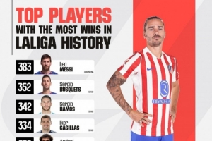 体育资讯3月8日讯 西甲统计了球员在该联赛的取胜场次,并列出西甲历史胜场排名,梅西383胜居首,格列兹曼310胜跻身前十。