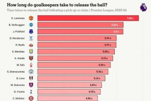 本赛季英超门将在捡球或接球后的出球时间(从慢到快排列)